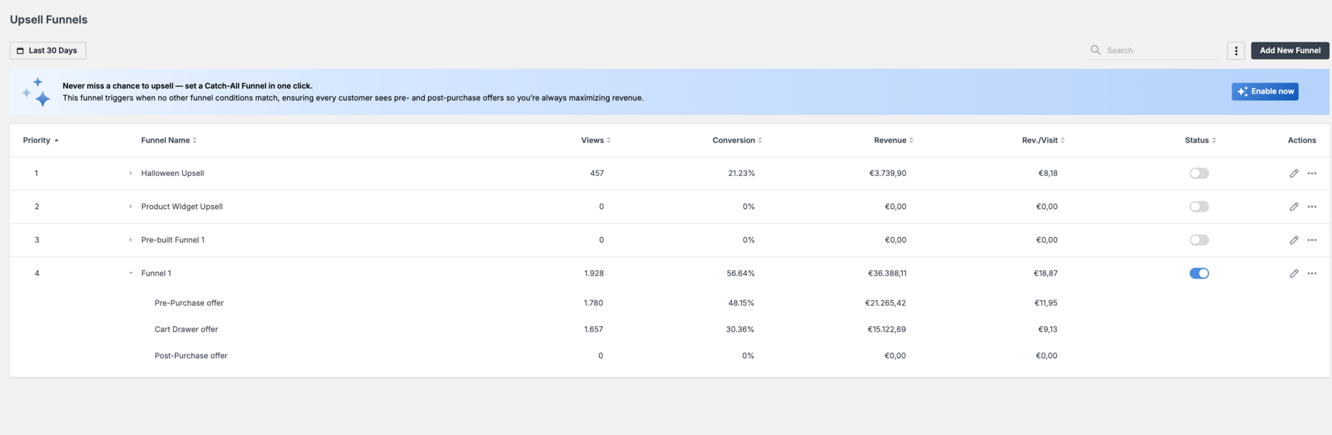 Das ist einmal ein Screenshot von einem Kunden aus den letzten 30 Tagen. Upsells auf der Dankesseite sind nicht möglich, weil wir kein Shopify Payments nutzen:
